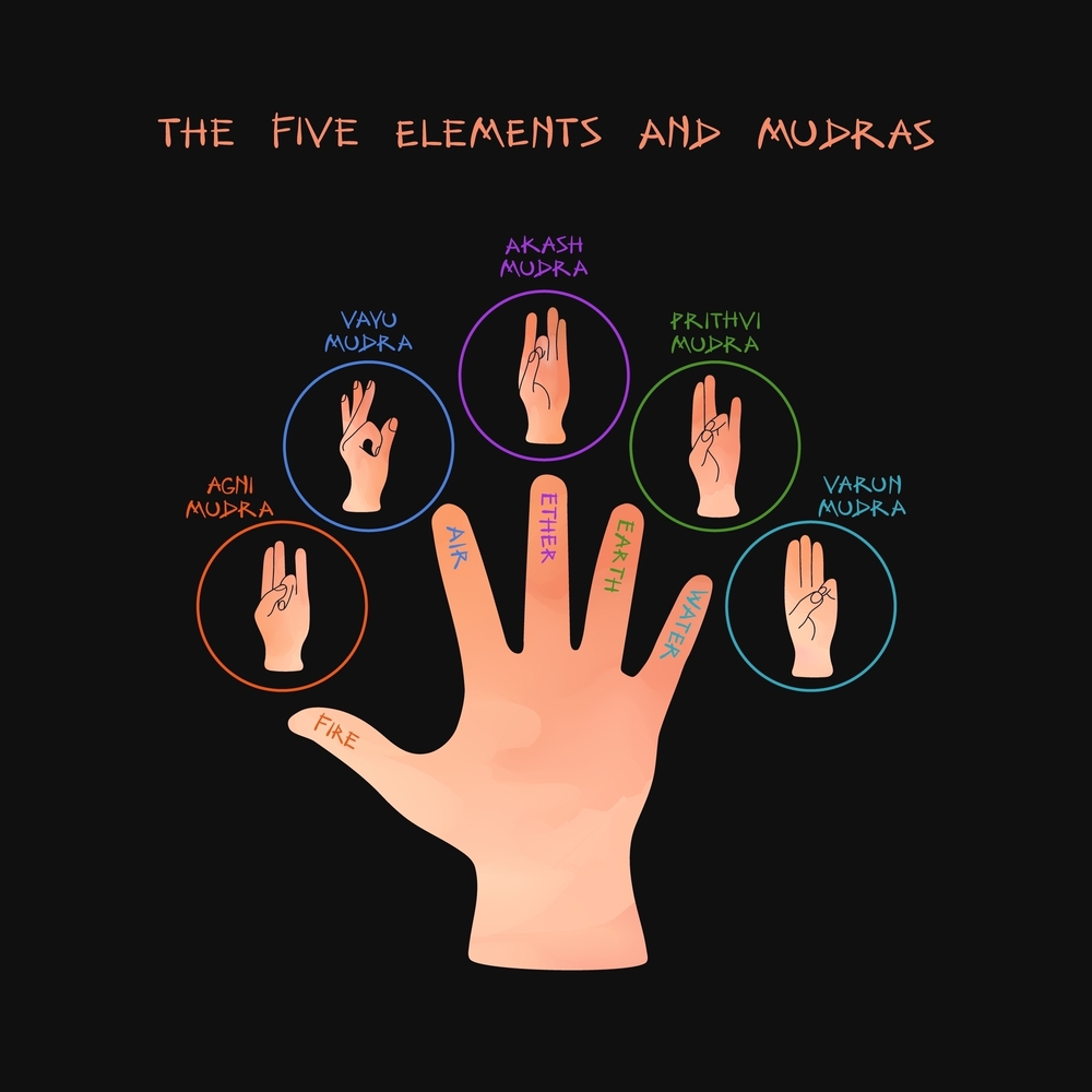 By making a hand mudra, you are literally using a dial to either step up or down the flow of one of these Vayus. An example is a mudra, which enhances fire (thumb) to improve Samana Vayu, which raises digestion!